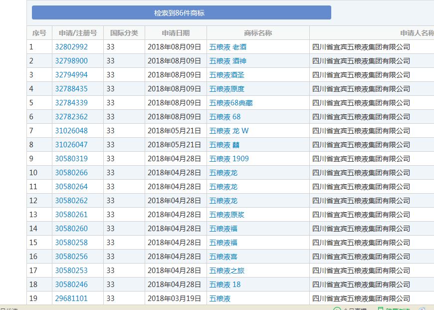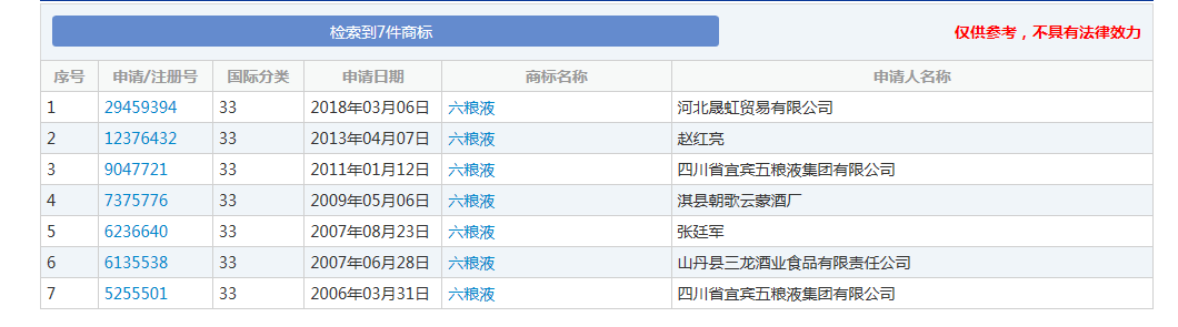 前兩天,邊肖在中國商標局官網(wǎng)查詢。結果她驚喜地發(fā)現(xiàn)“六糧液”,而且已經(jīng)進入初審公告期。在查詢33種白酒商標時,檢索到以下7條信息,均注冊為“六糧液”商標。只有兩條信息顯示“六糧液”商標的申請人為五糧液集團,其余均為他人申請。