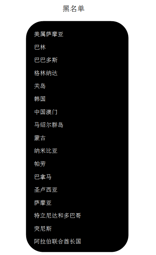 不合規(guī)的地區(qū)或國家被列入黑名單或顯示為灰色。第一份名單于2017年12月5日發(fā)布,當時有17個國家和地區(qū)被列入黑名單。具體包括的國家和地區(qū)如下圖所示,馬歇爾赫然在列。