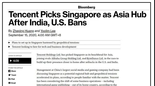 9月15日,繼阿里巴巴和字節(jié)跳動之后,騰訊集團(tuán)也選擇在新加坡設(shè)立其在亞洲其他地區(qū)的橋頭堡。